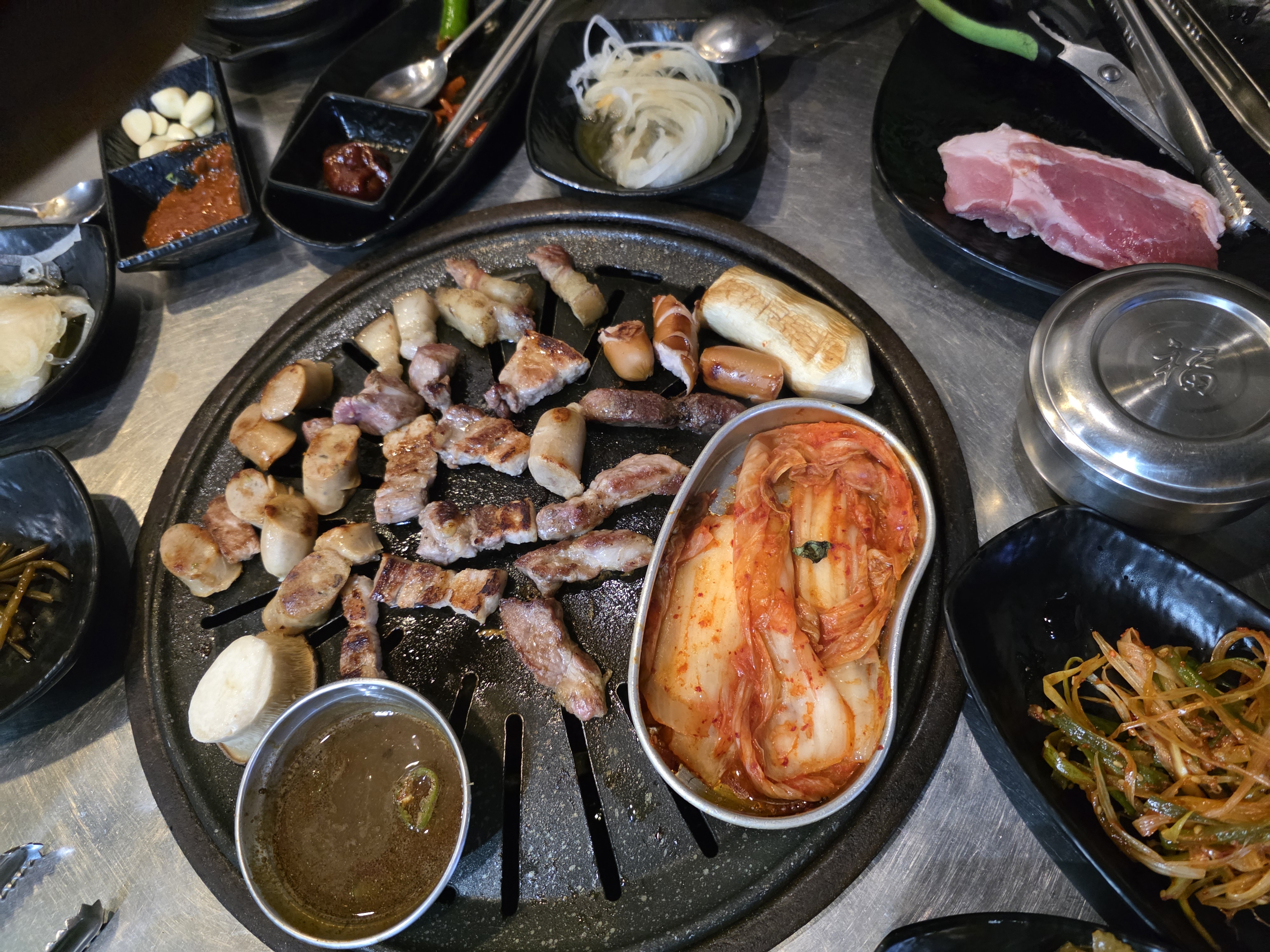 불판 위에 올리자 기름이 사르르 녹으며 노릇노릇 구워졌고,