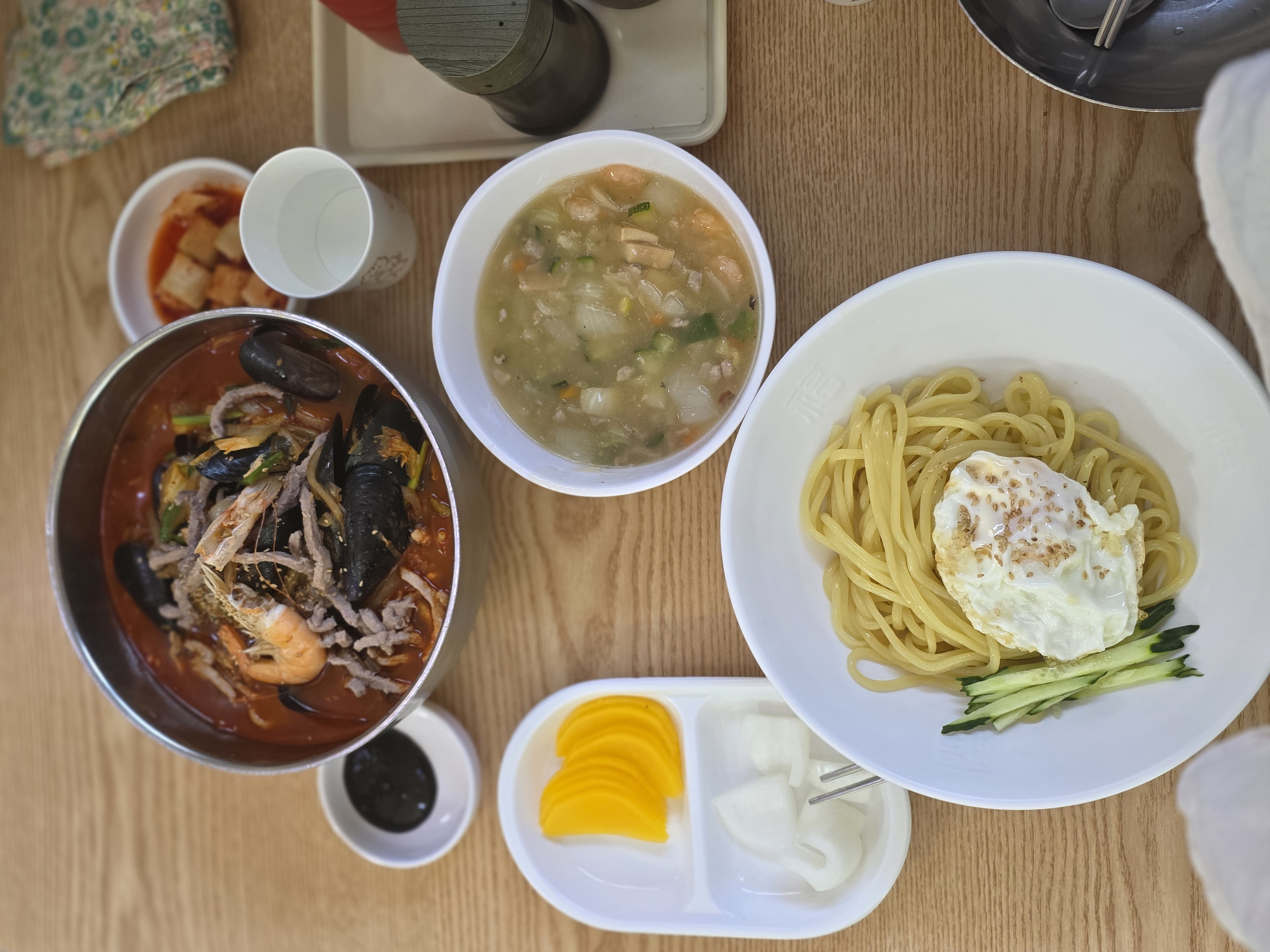 국물 한 숟갈을 떠먹자, 홍합과 오징어, 새우에서 우러나온 해물 향과 고기에서 나온 구수한 맛이 조화를 이뤘습니다. 야채는 아삭하게 살아 있었고, 면은 물짜장과 같은 탄력 있는 생면이라 국물과 잘 어울렸습니다. 매운맛을 즐기는 사람이라면 테이블 위 고추기름을 추가해 먹으면 풍미가 한층 깊어집니다.