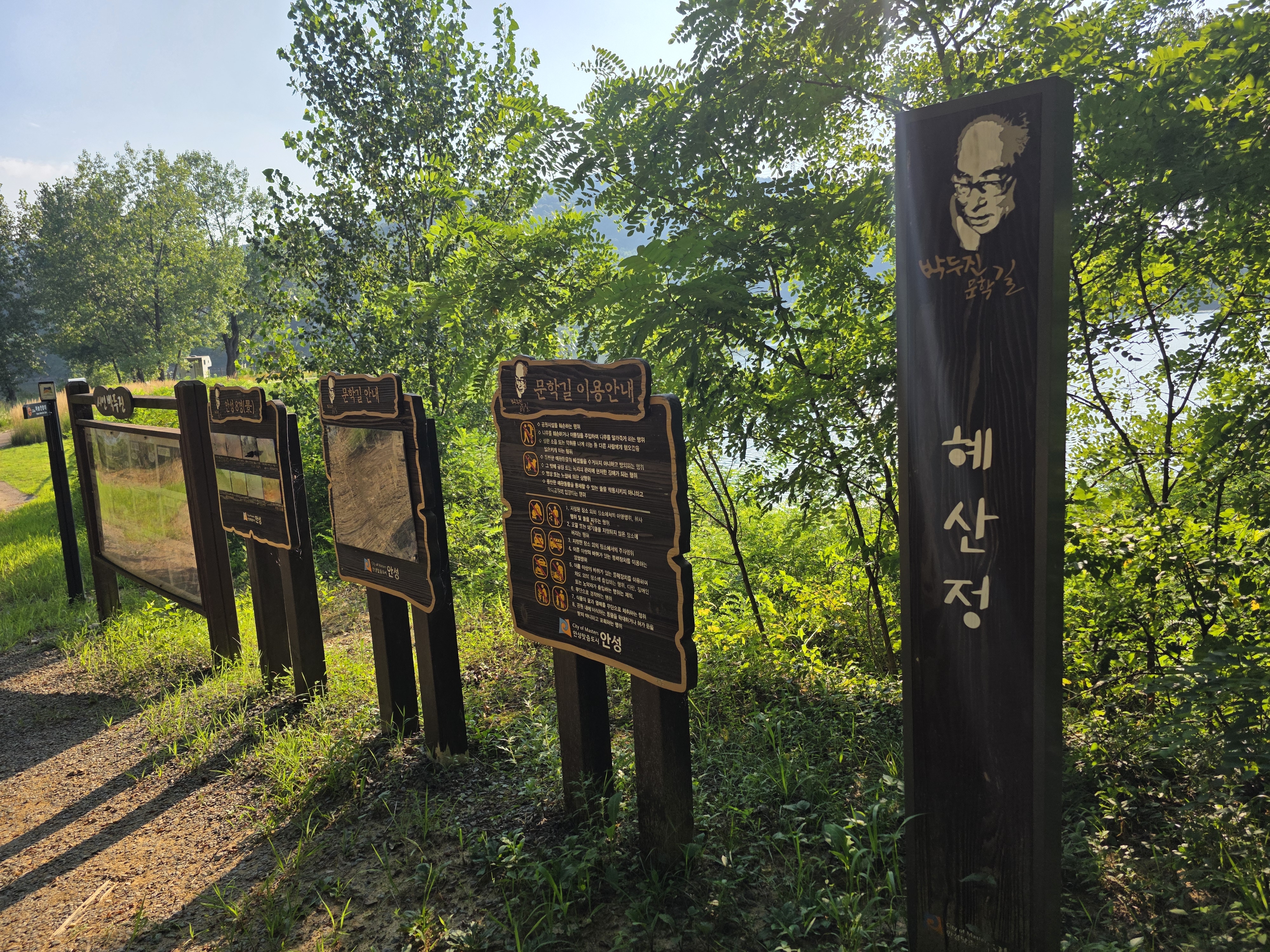 걷다 보면 작은 정자와 의자가 마련된 쉼터가 나타납니다. 이곳에 앉아 바람을 느끼며 시를 읽는 시간이 참 좋았습니다. 한켠에는 시인의 생애와 문학 활동을 정리한 패널이 있어, 작품 배경과 의미를 더 깊이 이해할 수 있었습니다.